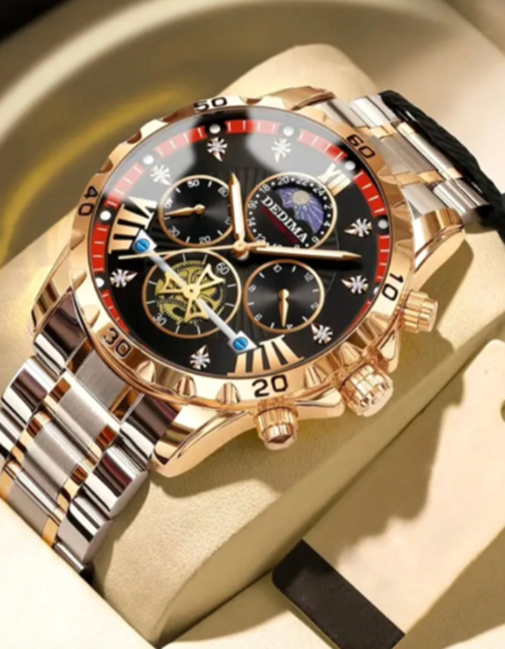 Com caixa em aço rosé polido, mostrador preto com detalhes dourados e aro vermelho, e pulseira bicolor em aço inoxidável, este relógio não é apenas um acessório — é uma declaração silenciosa de poder e presença.