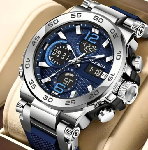 O FOXBOX Blue Steel Chronograph, selecionado pela GLEXCY PRESTIGE, combina tecnologia e robustez em uma estrutura que traduz poder e sofisticação masculina.