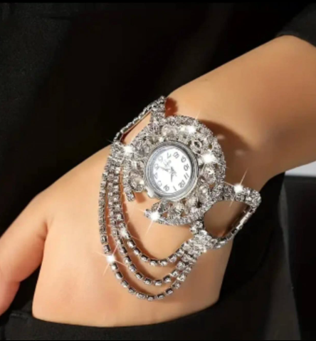 Seu mostrador prateado limpo reflete a luz de forma discreta, enquanto sua pulseira ornamental — bordada em pedras — confere caráter de joalheria ao pulso feminino.